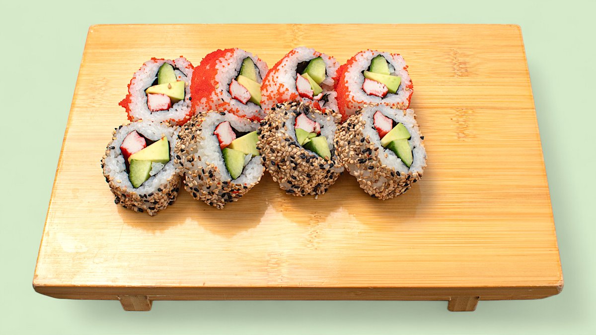 6x Nigiri (tuna fillet, sea bream, salmon fillet, boiled prawns, egg omelet and boiled eel) 2x4 California Roll 1x Gunkan (1 salmon caviar)
