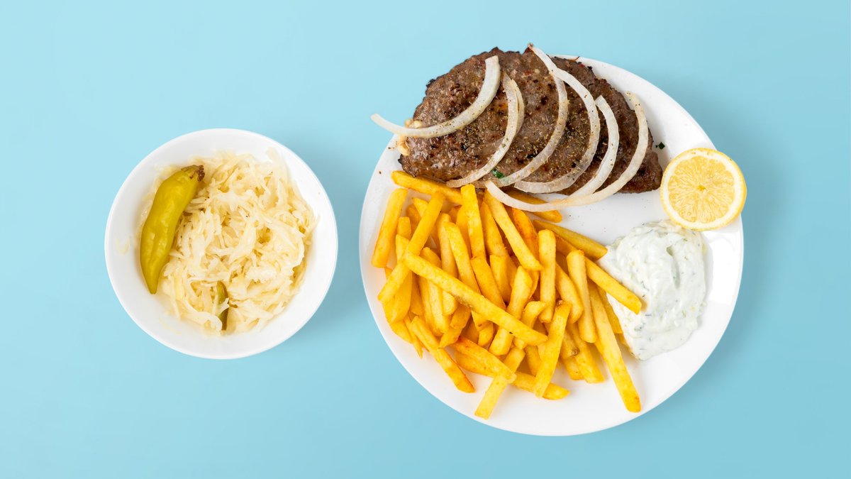 alle Gerichte werden mit Olivenöl, Salz, Krautsalat und Tsatsiki zubereitet und einer Beilage deiner Wahl serviert („Cevapcici” und „Schaschlickspieß” werden ohne Olivenöl, Salz, Krautsalat und Tsatsiki zubereitet und einer Beilage deiner Wahl serviert )