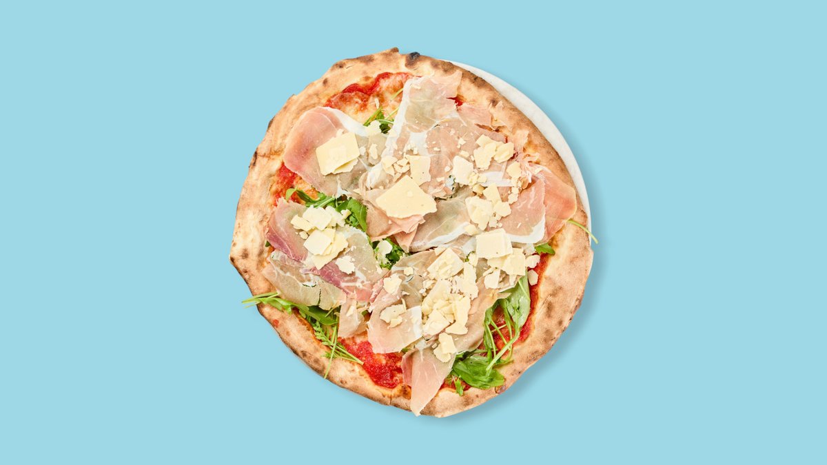with tomato sauce, Fior di Latte, Parma ham from pork, arugula and Grana Padano