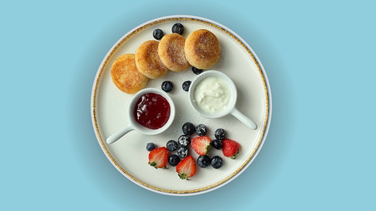 Fluffige, goldbraun gebratene Quarkpfannkuchen nach traditioneller Art. Serviert mit Sauerrahm und einer fruchtigen Beilage.