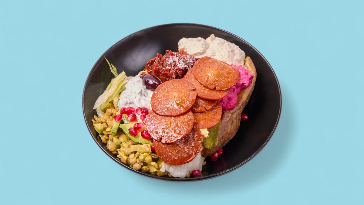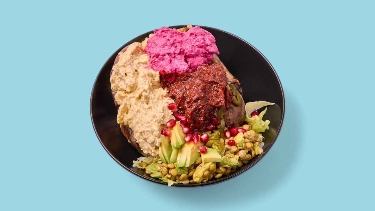 mit Ofenkartoffeln, Käse, Olivenöl, Linsen, Rote Beete, Quinoa, Ezme, Avocado, Mais, Auberginencreme, Tsatsiki, Hummus und Jalapeñoscreme