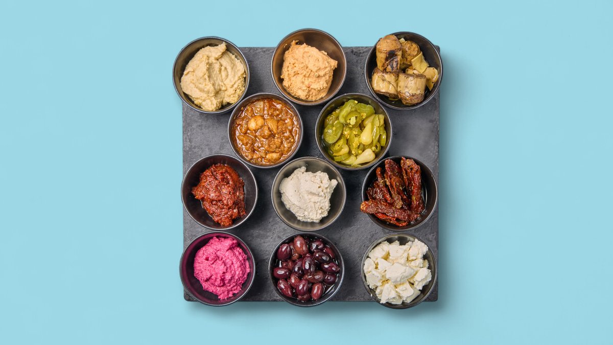 mit Reis, Linsen, Rote Beete, Quinoa, Ezme, Avocado, Mais, Auberginencreme, Tsatsiki, Hummus und Jalapeñoscreme