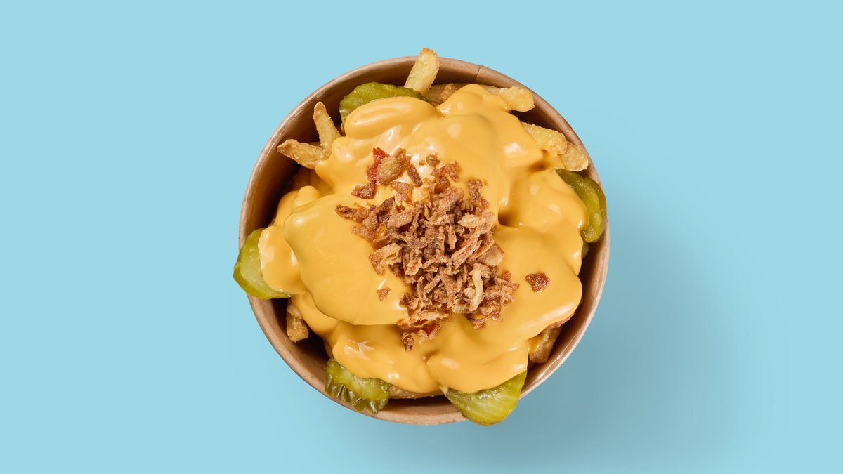 with crispy fries, chicken nuggets, pickles and Cheddar cheese sauce