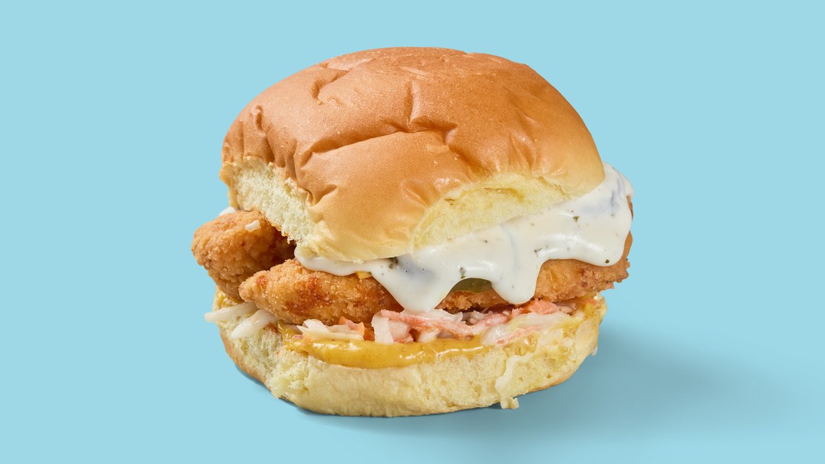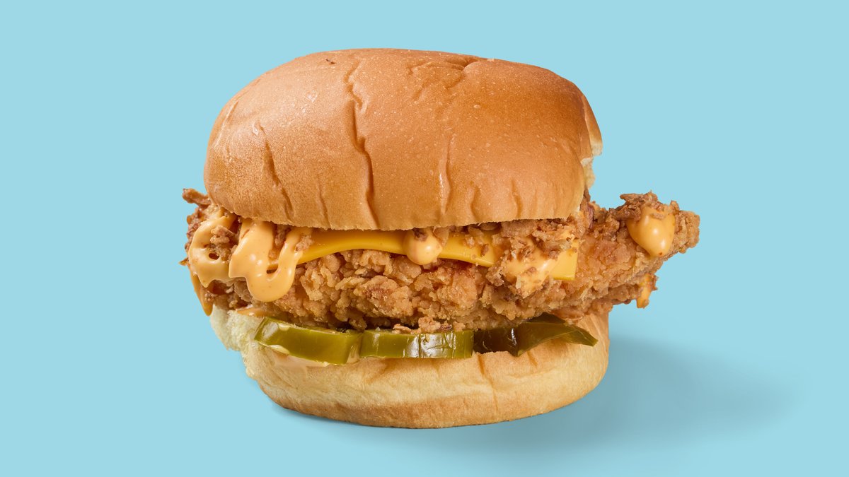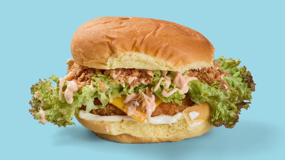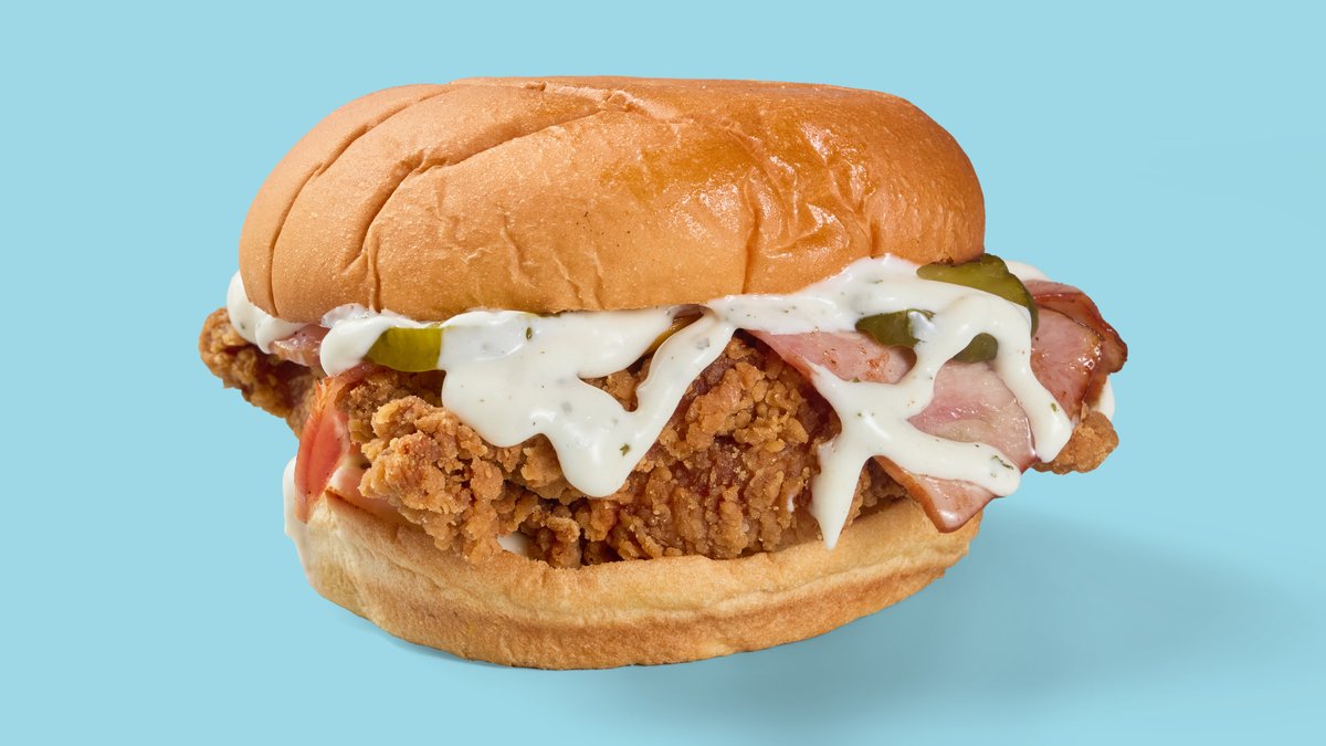 with chicken tender, lettuce, bacon, pickles, Cheddar cheese, fried onions, Parmesan and ranch sauce