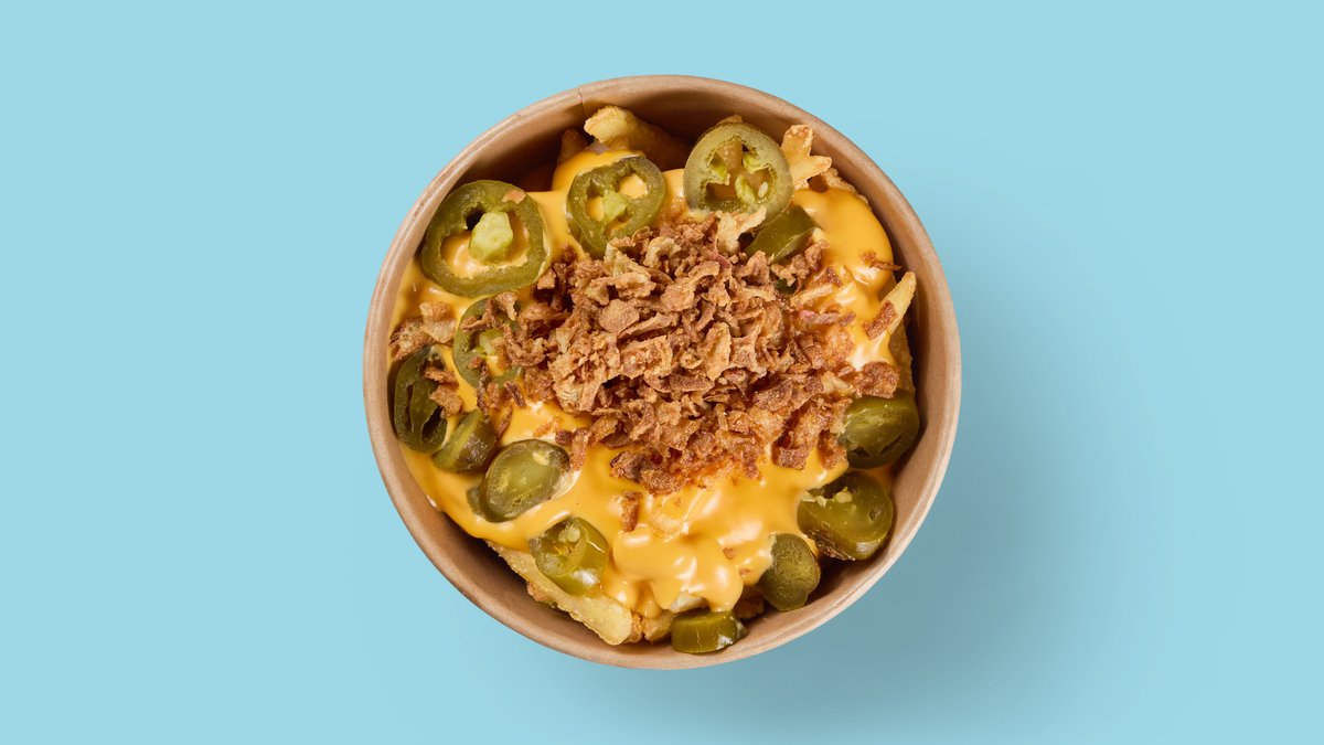 with crispy fries, Cheddar cheese sauce, jalapeños and fried onions