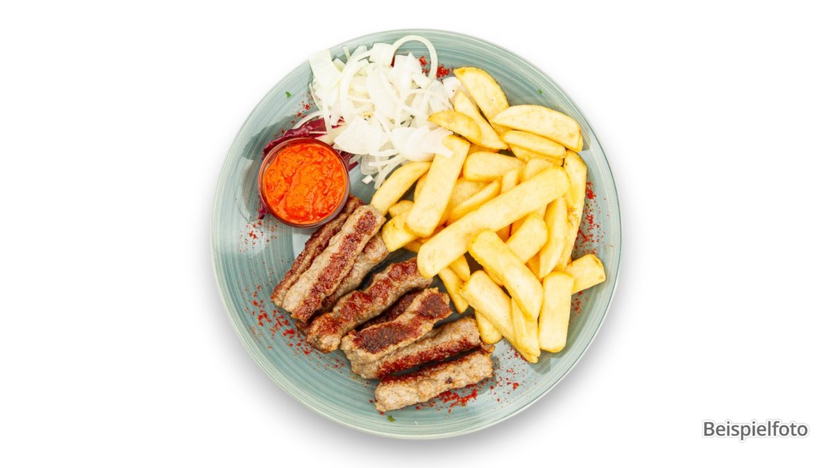 6 pieces made from mixed minced beef and pork with onions, ajvar, djuvec rice and French fries