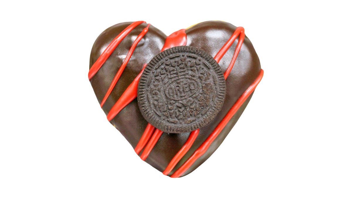 Donut in Herzform mit weißer Schokoladenfüllung, Schokoladenglasur, dekoriert mit rotem Vanille-Drizzle und Oreo-Keks Das Gericht wurde mit Schokolade zubereitet und kann Spuren von verschiedenen Nüssen enthalten