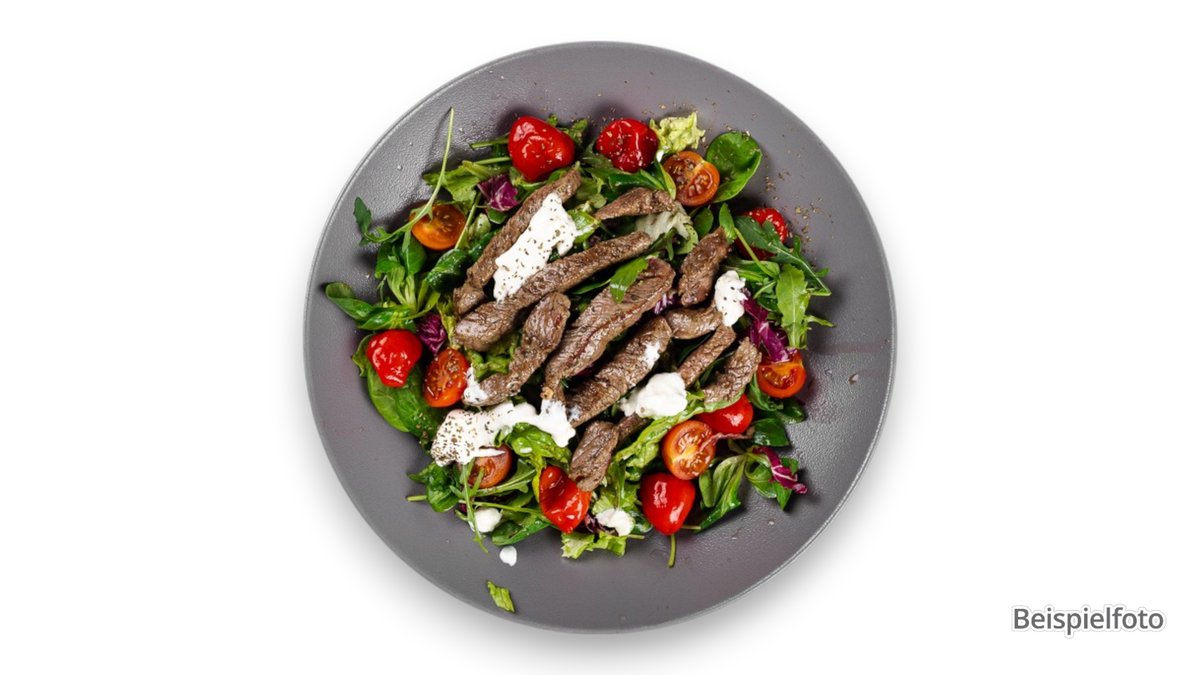 large mixed salad with slices of beef sirloin and mozzarella sticks