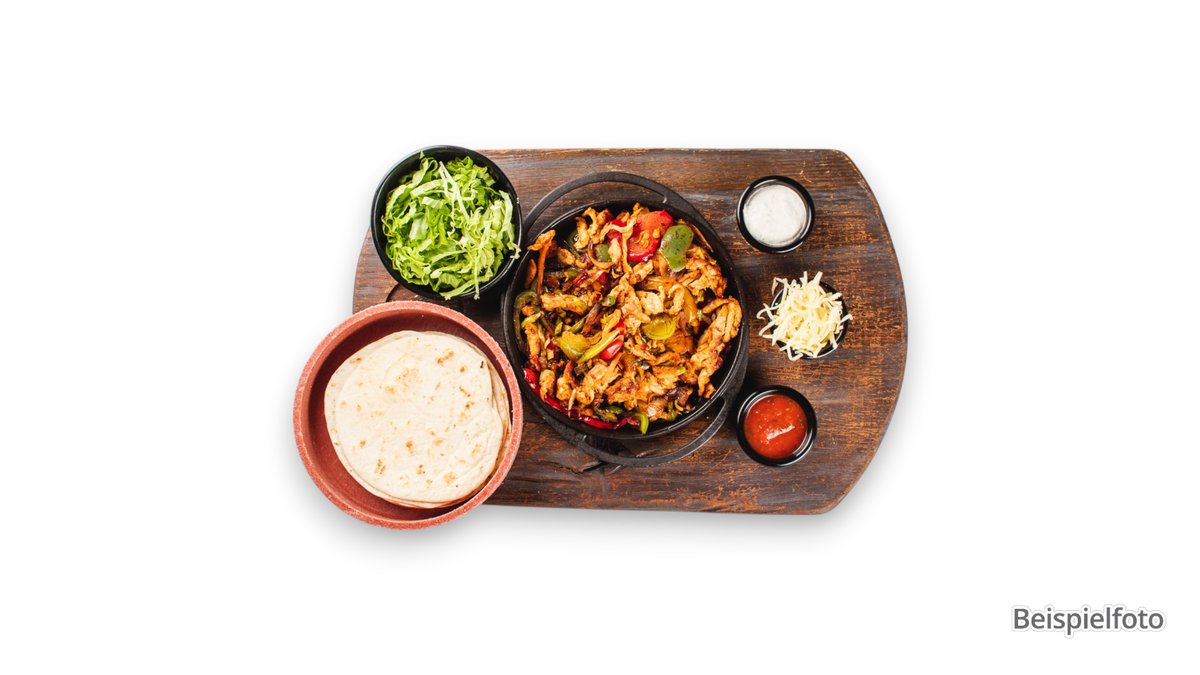 all dishes are fried in a hot cast iron pan with onions, bell peppers and a fajita marinade and prepared in a style of preparation of your choice