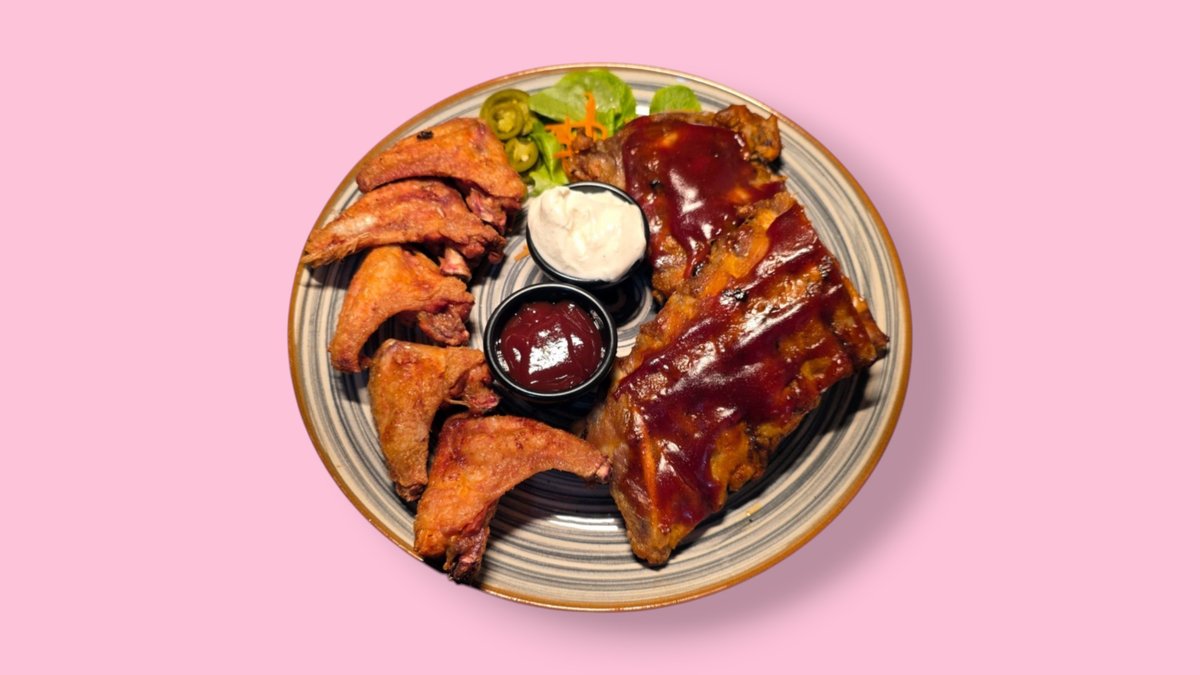 chicken wings and baby spare ribs with sour cream and barbecue sauce
