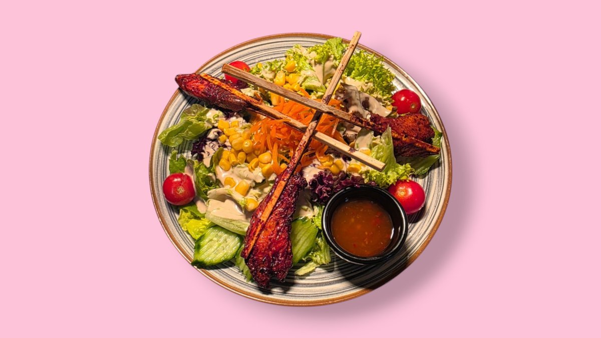 mixed salad with 3 marinated chicken skewers and sweet chili sauce