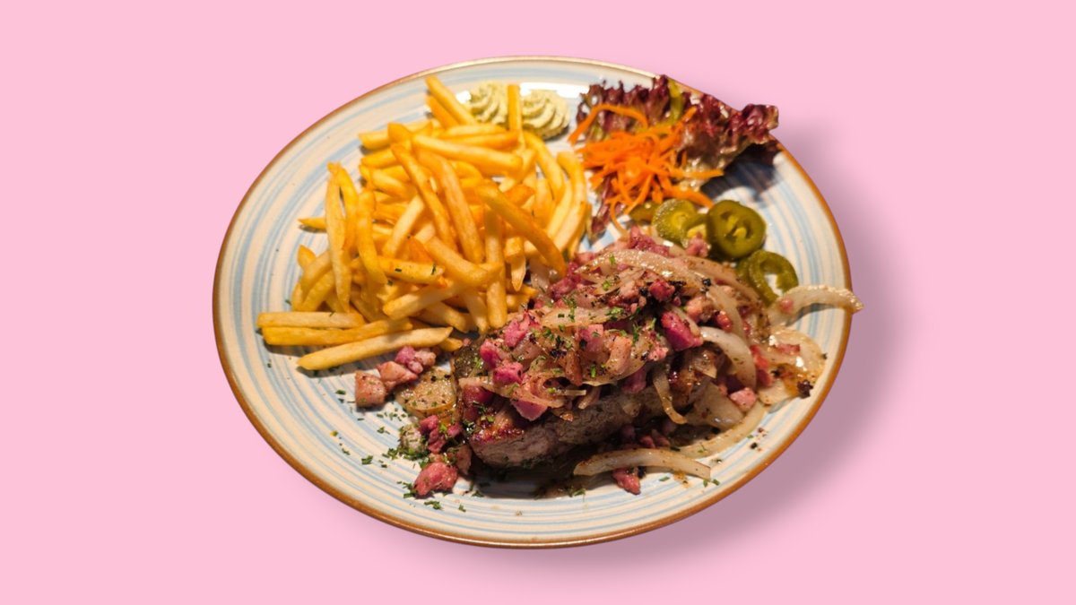 grilled rump steak with fried pork bacon, onions and herb butter