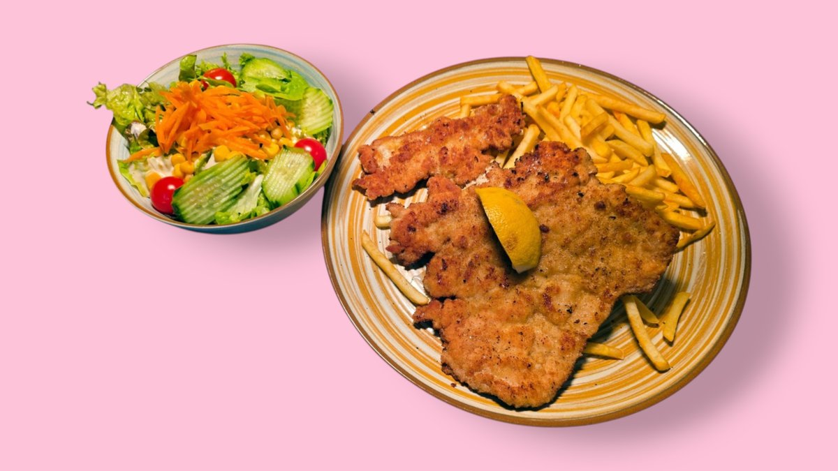 breaded pork schnitzel with French fries and a small mixed salad