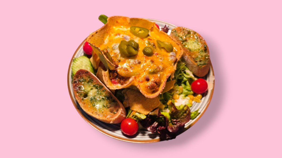 mixed salad with chips, chili con carne in a corn tortilla bowl topped with cheese