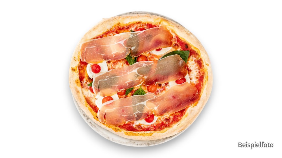 with tomato sauce, mozzarella, San Daniele ham, Parmesan and rocket