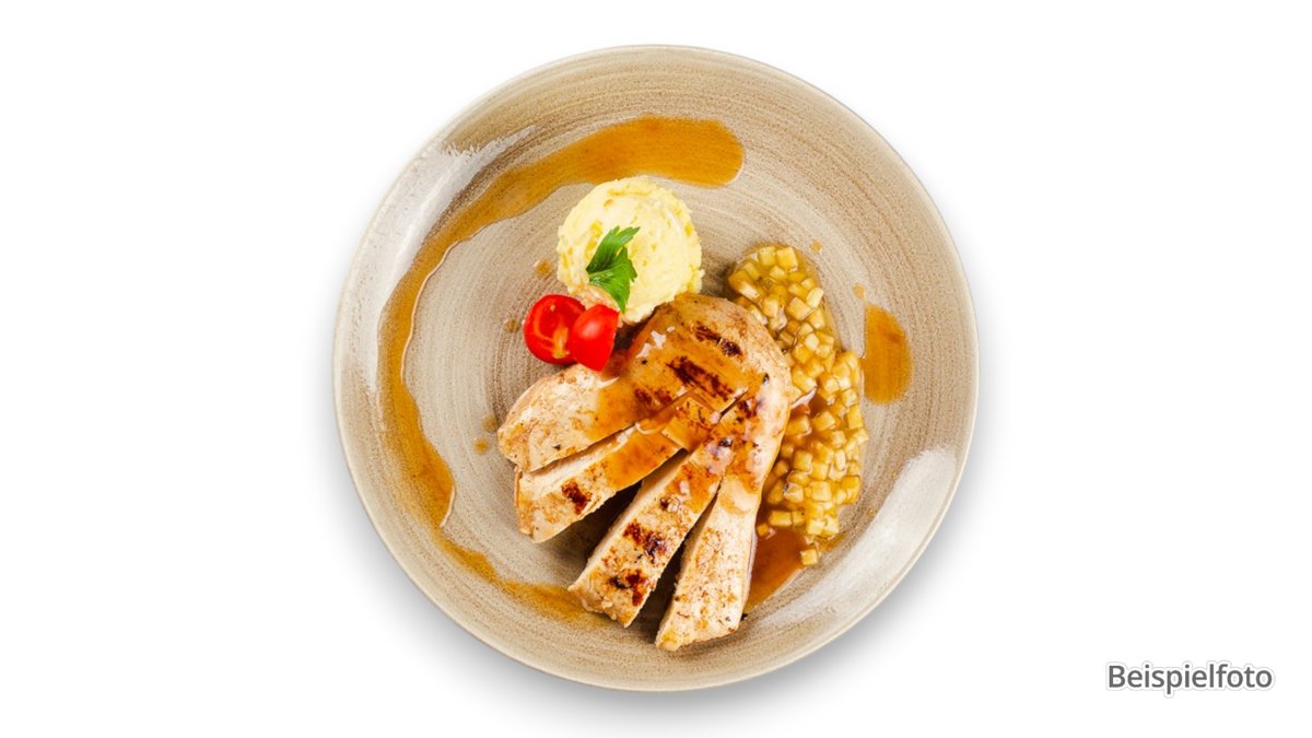 mit Putenschinken, Curry-Mangosoße, Salat, Gurken und Skin Potatoes