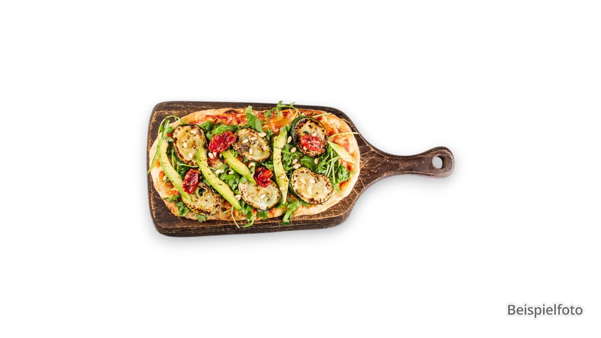 mit Tomaten, Basilikum, gerösteter Paprika, Ziegenkäse, Avocado und hausgemachtem Pesto