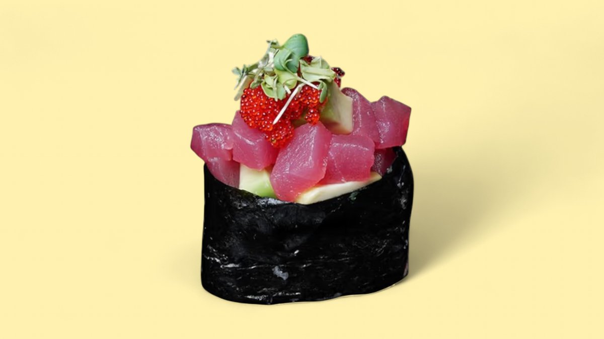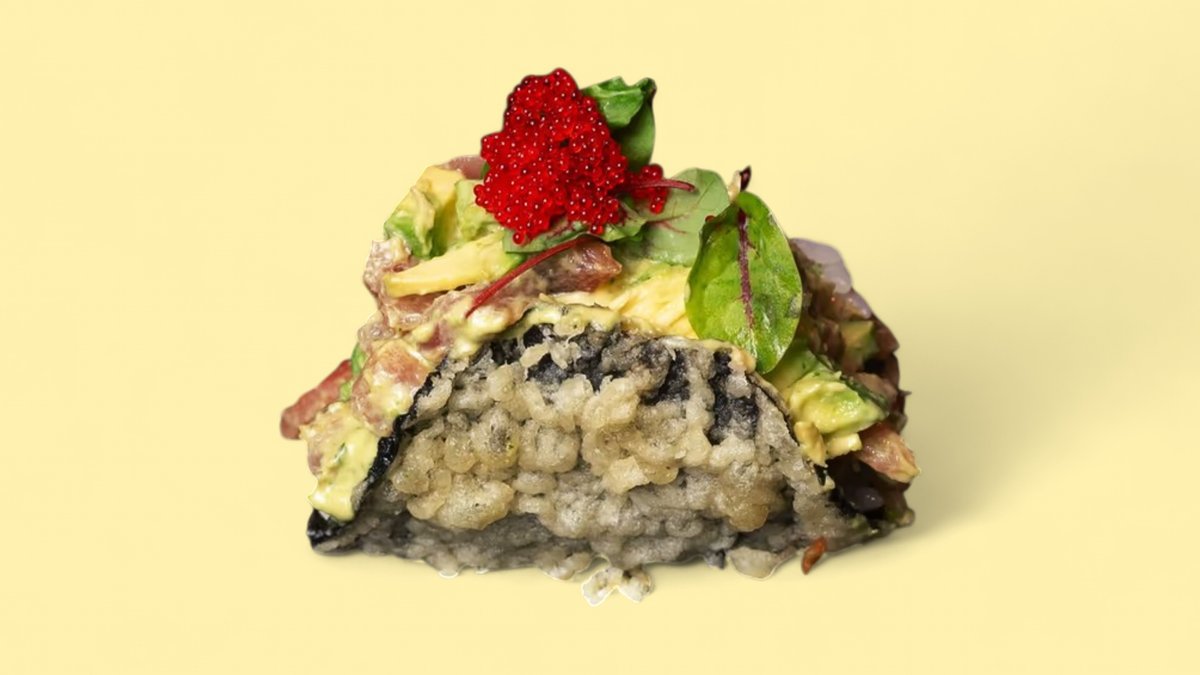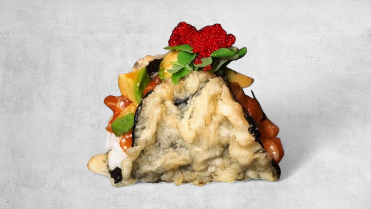 Knusprig frittierte Nori in Taco-Form gefüllt mit Reis, frischen Thunfischwürfeln, gehackten roten Zwiebeln mit Avocadosauce, Tobiko garniert.