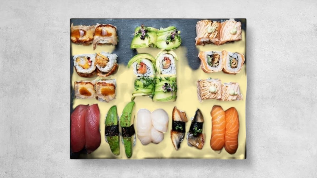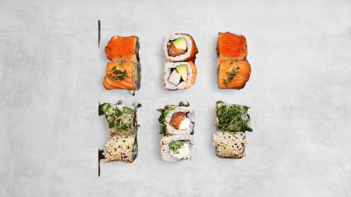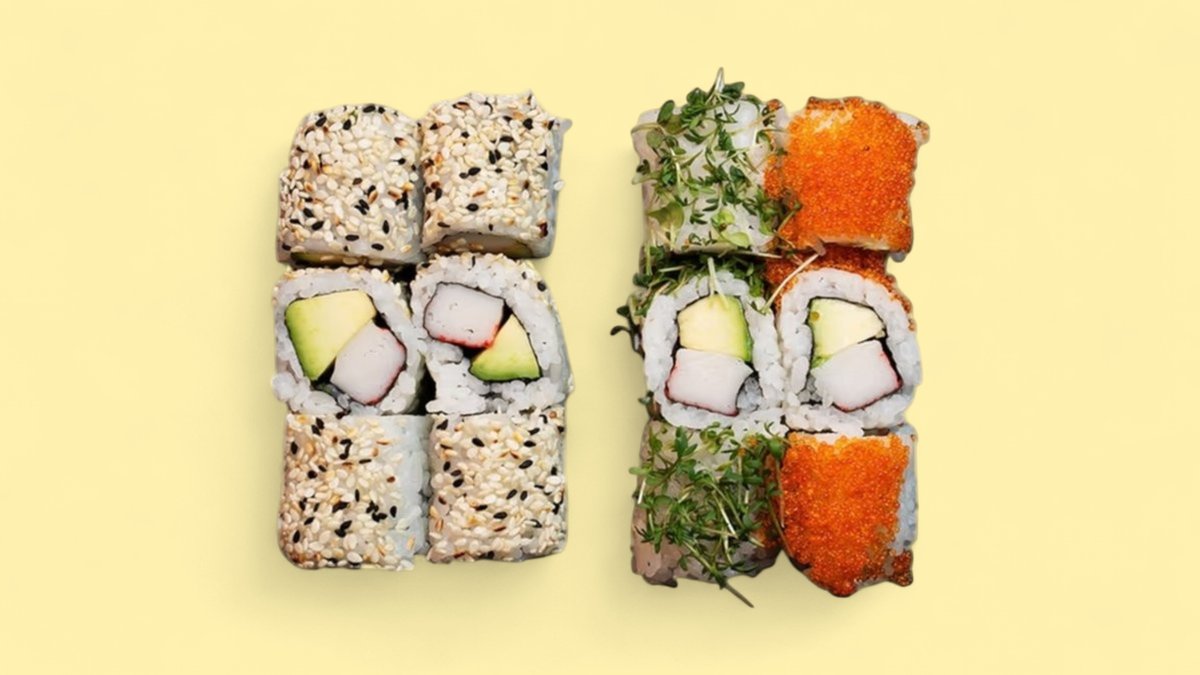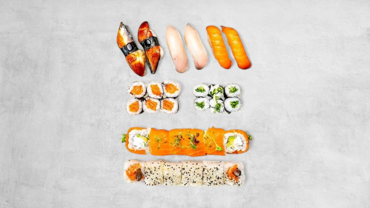 3x Tobiko California 3x Tazuna California 3x Avocado Maki 3x Lachs Maki 2x Lachs Nigiri 1x Tuna Nigiri