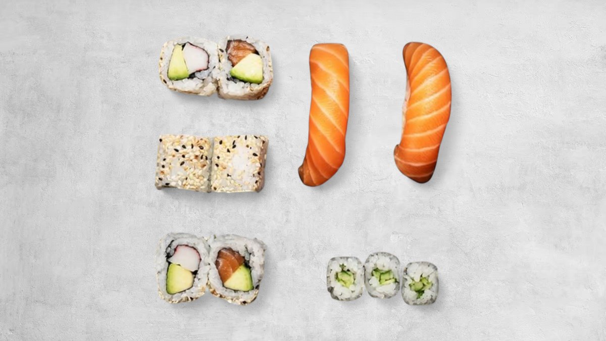 3x California Rolle 3x Avocado Philadelphia 3x Gurken Maki 3x Lachs Maki 1x Lachs Nigiri 1x Tuna Nigiri 1x Ebi Nigiri