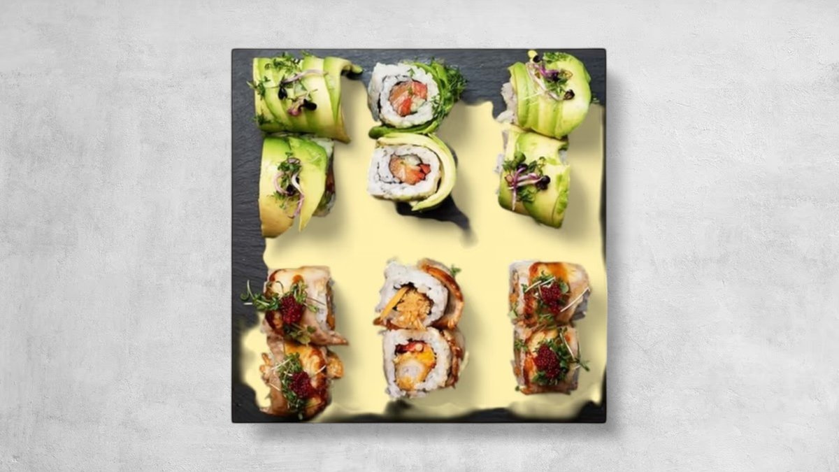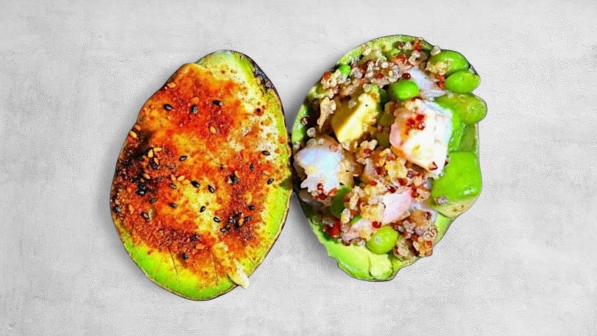 Eine Hälfte mit flambiertem Eigelb(pasteurisiert) und Mayonnaise, die andere mit Avocado, Quinoa, Edamame, Garnelen, Minze und Zitrone.