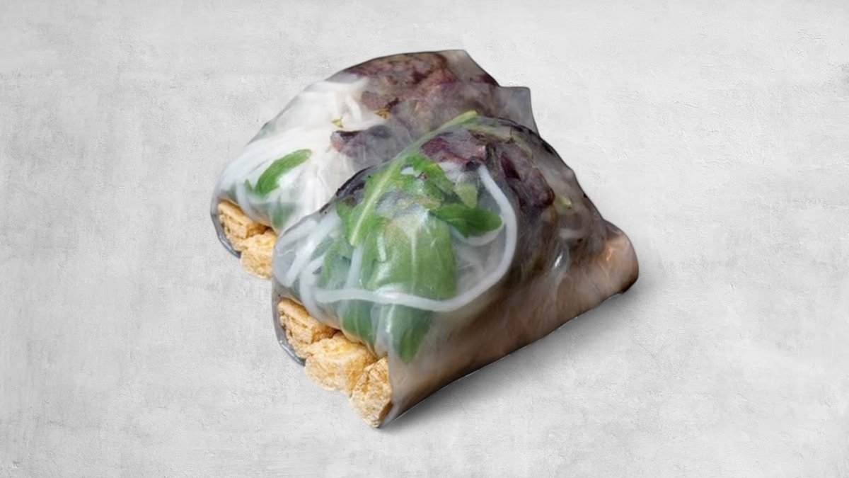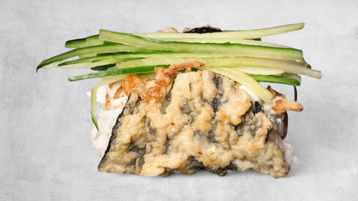 Knusprig frittierte Nori in Taco-Form gefüllt mit Reis, Frischkäse, Gurken und getrocknete Zwiebeln.