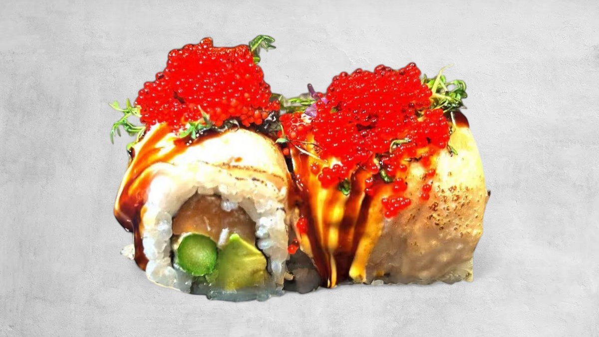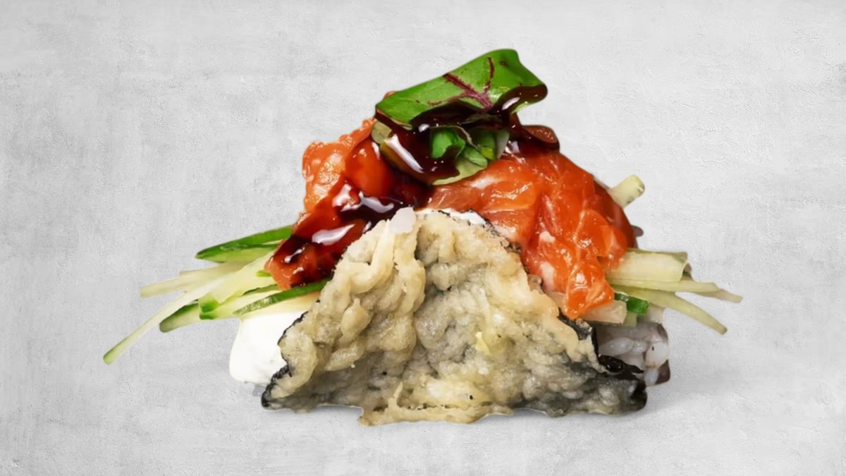 Flammen-Lachs Sushi Deluxe mit Mango, Frischkäse, Garnelentempura und Fliegenfischrogen.