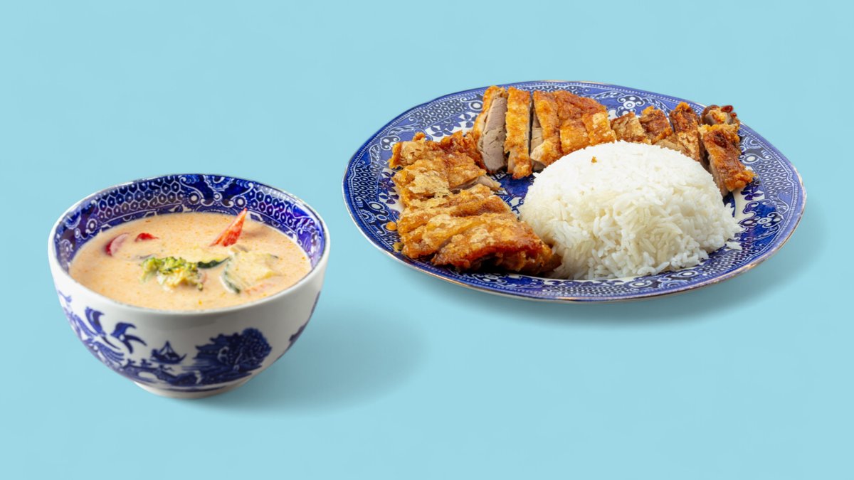 spicy, fried chicken with vegetables in spicy thai red curry coconut milk