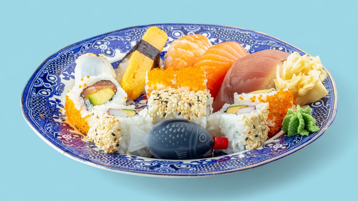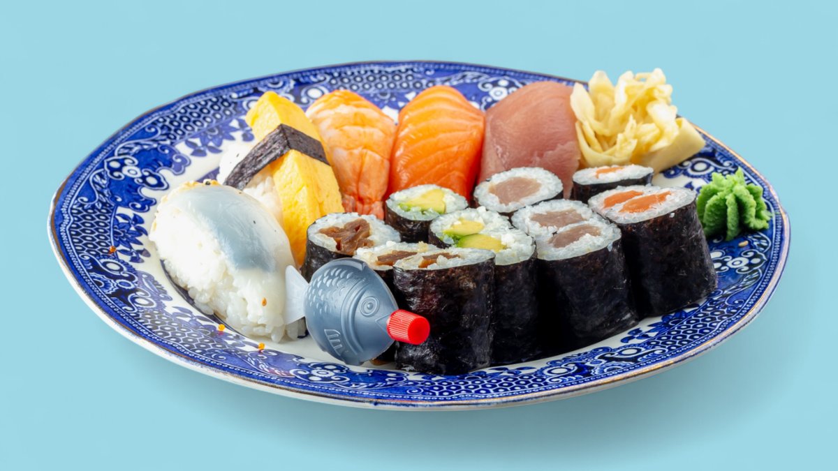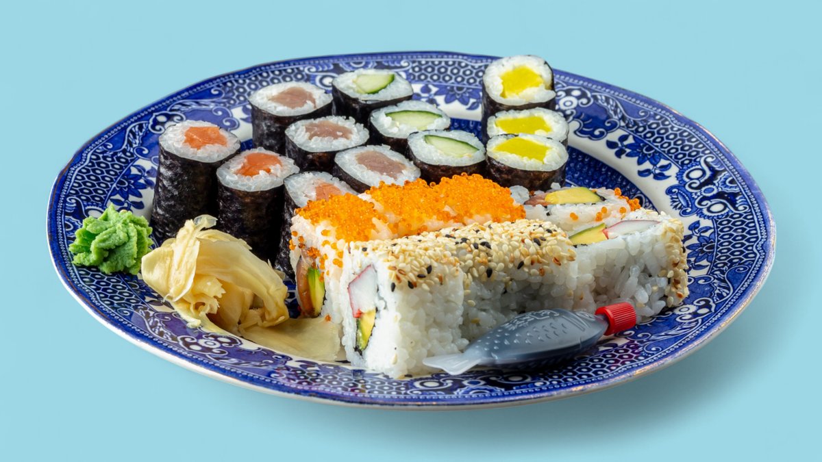 4x nigiri salmon, tuna, cuttlefish, and prawns, 3x cucumber rolls, 3x salmon rolls, 6x california rolls