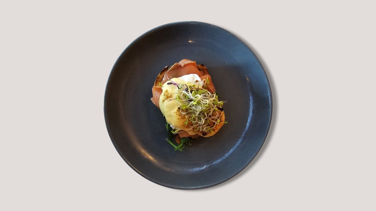 mit frischem Kasten-Weißbrot, 2 pochierte Eiern, Räucherlachs, Babyspinat und Sauce hollandaise