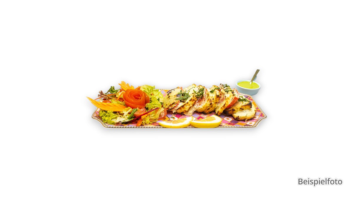 pikant zarte marinierte Hähnchenfiletstücke, gegrillt, mit Mischung aus Obst und Gemüse nach traditioneller nordindischer Art