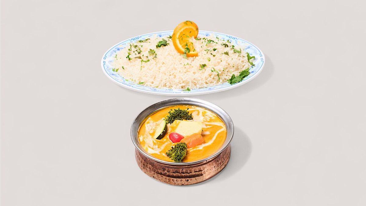 alle Gerichte werden mit frischem Gemüse, würzigen Soßen, Basmatireis und Naan serviert