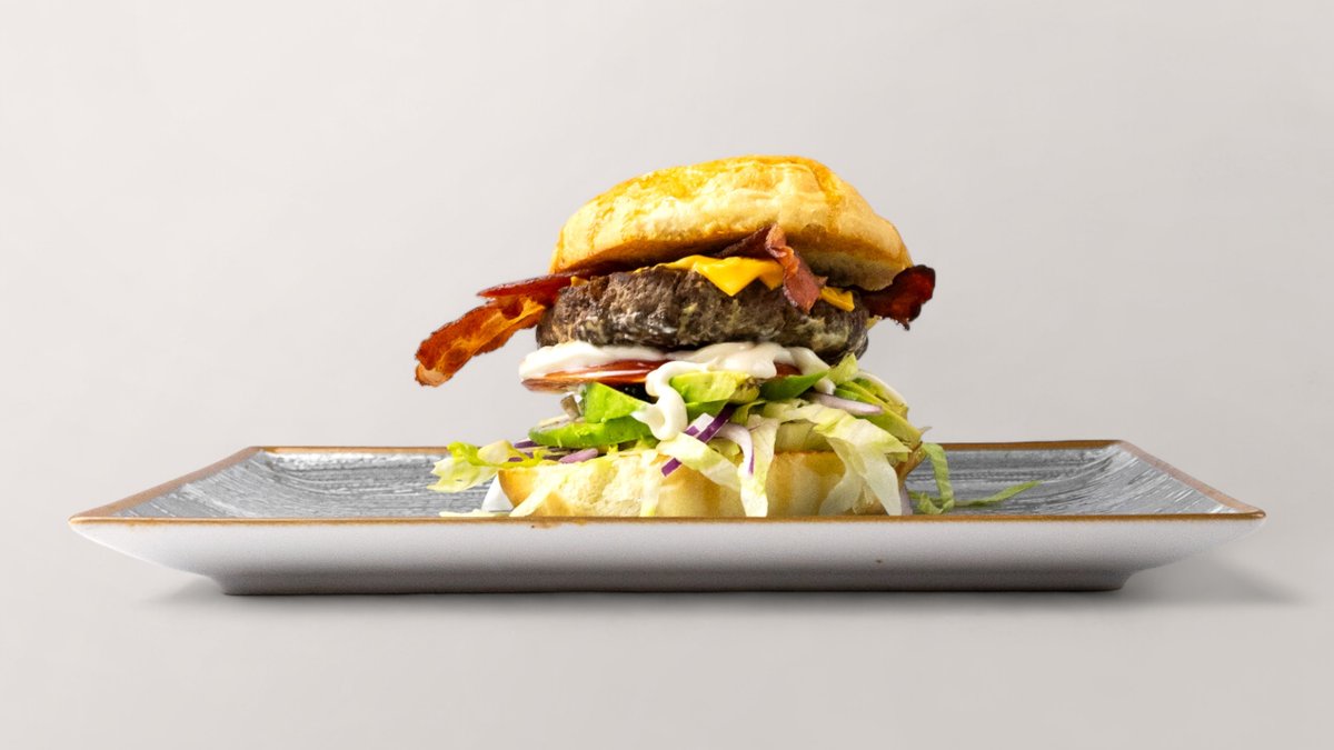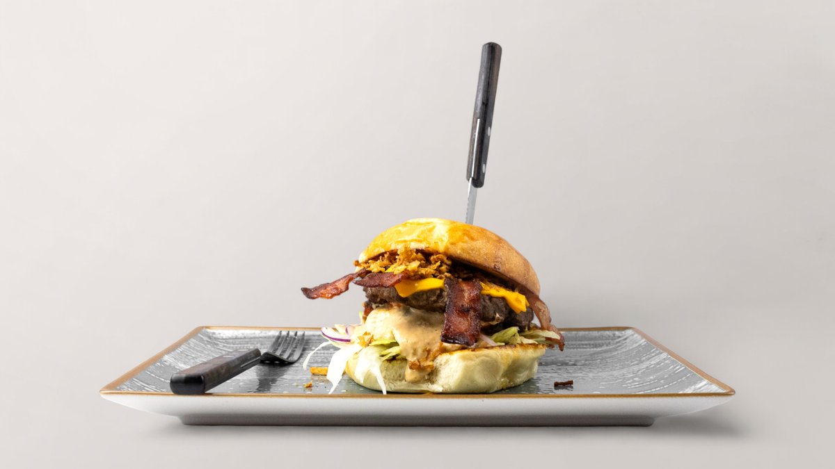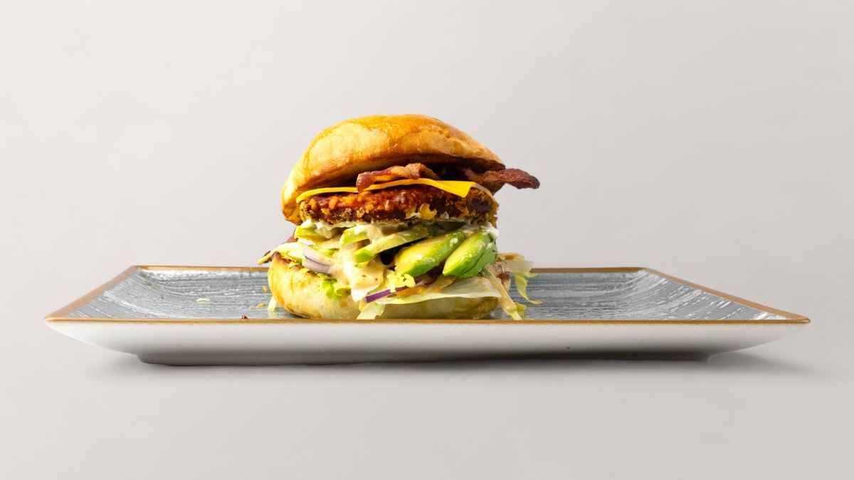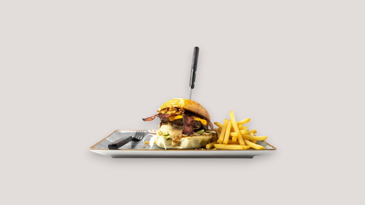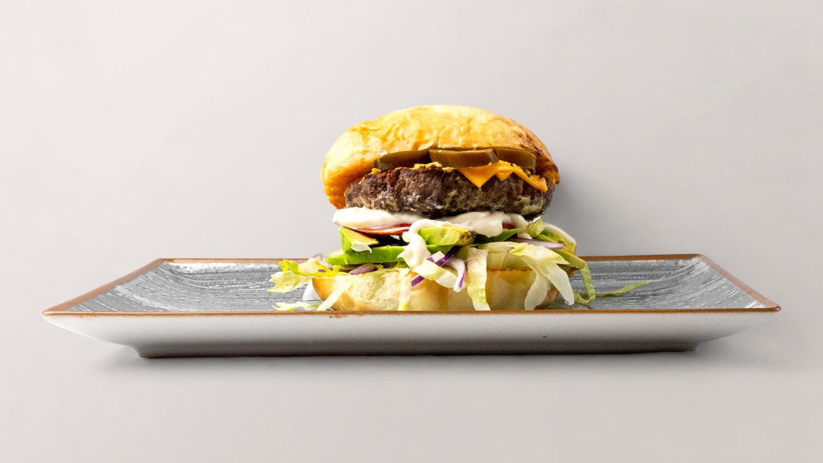with approx. 180g beef, white cabbage, cucumbers, Cheddar cheese, roasted onions, bacon and avocado balsamic cream