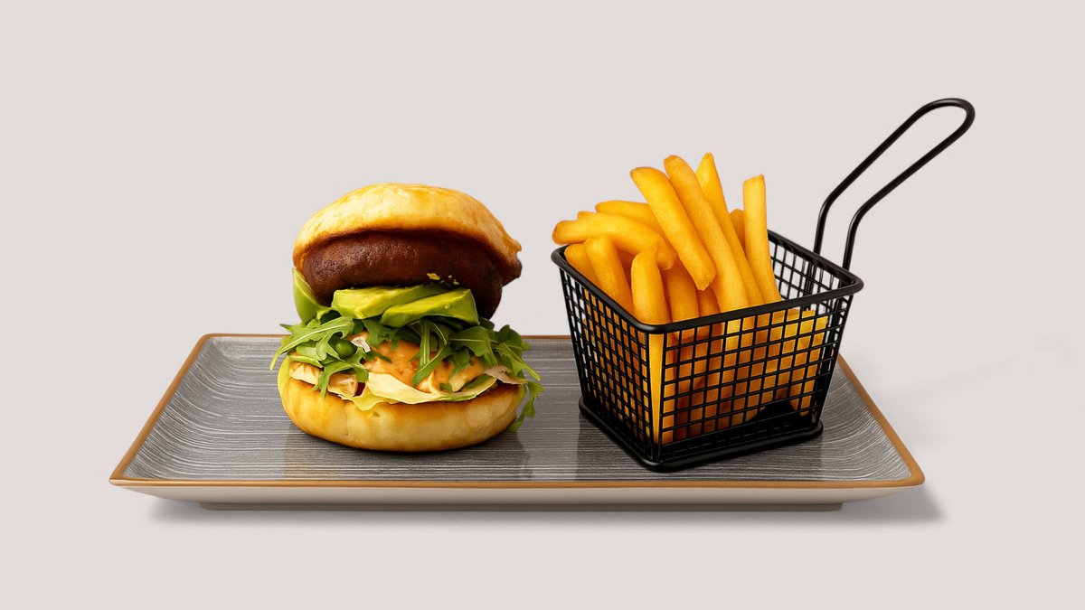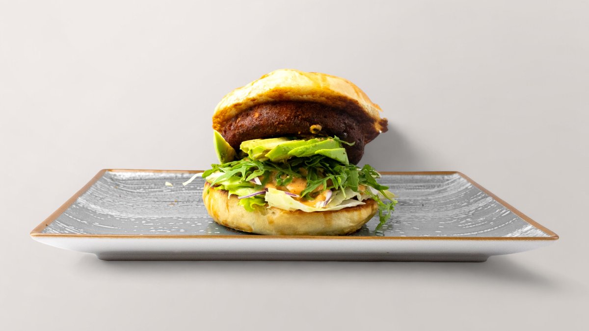 with Jeffrey's special sauce, avocado, tomatoes, onions, cucumbers, rocket salad and roasted onions