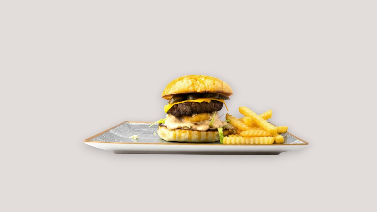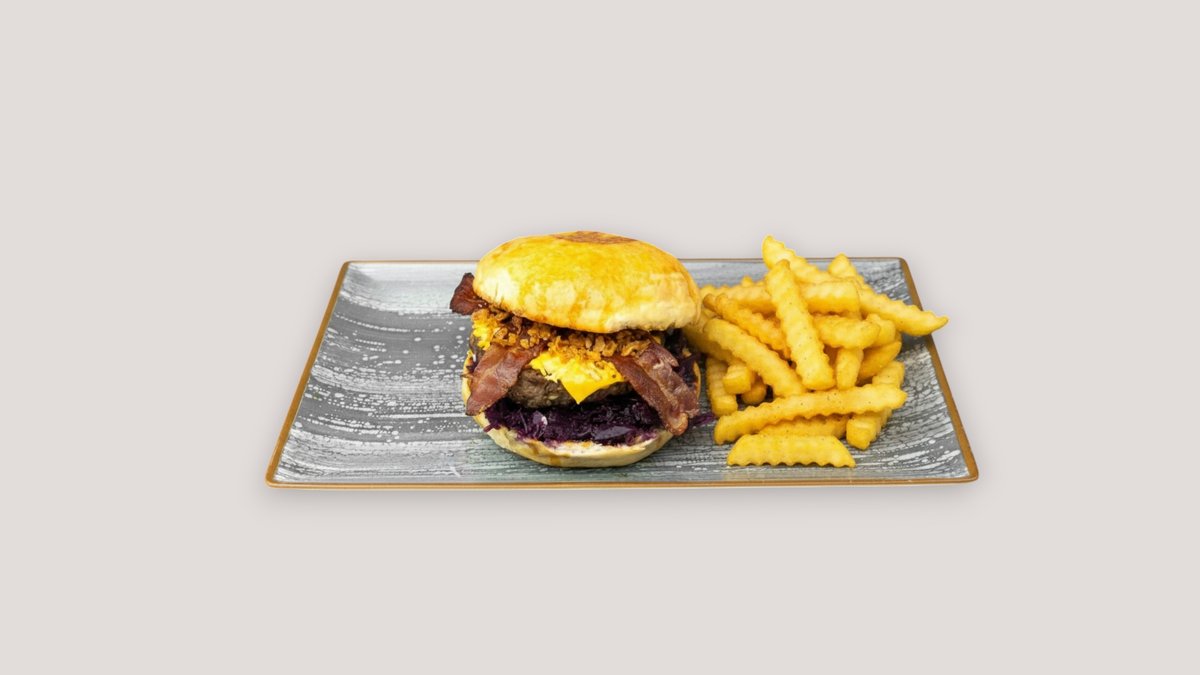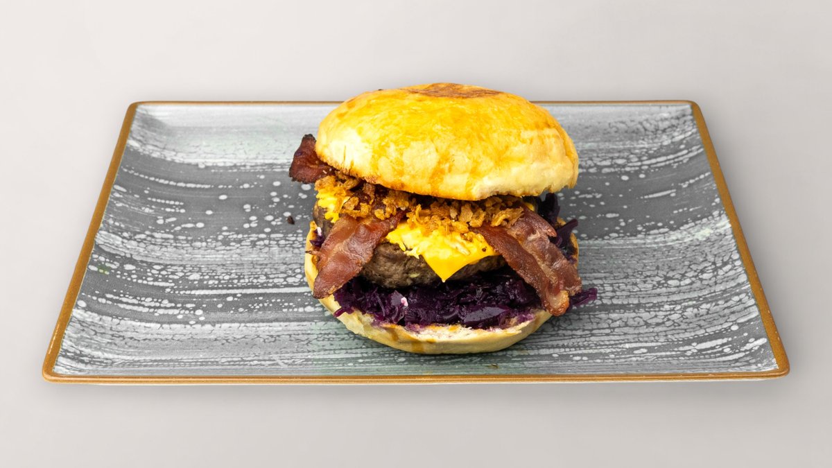 with approx. 180g beef, red cabbage, cucumbers, Cheddar cheese, roasted onions, bacon and barbecue sauce