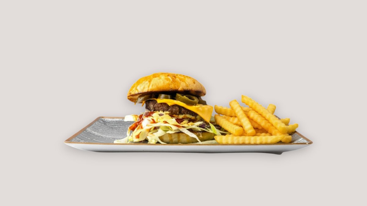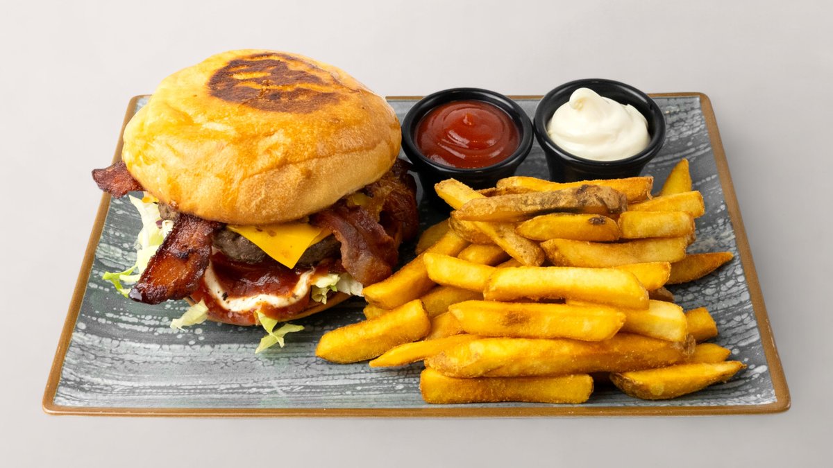 with 180g beef, tomatoes, cucumbers, Cheddar cheese, ketchup, mayonnaise, fried onions and bacon