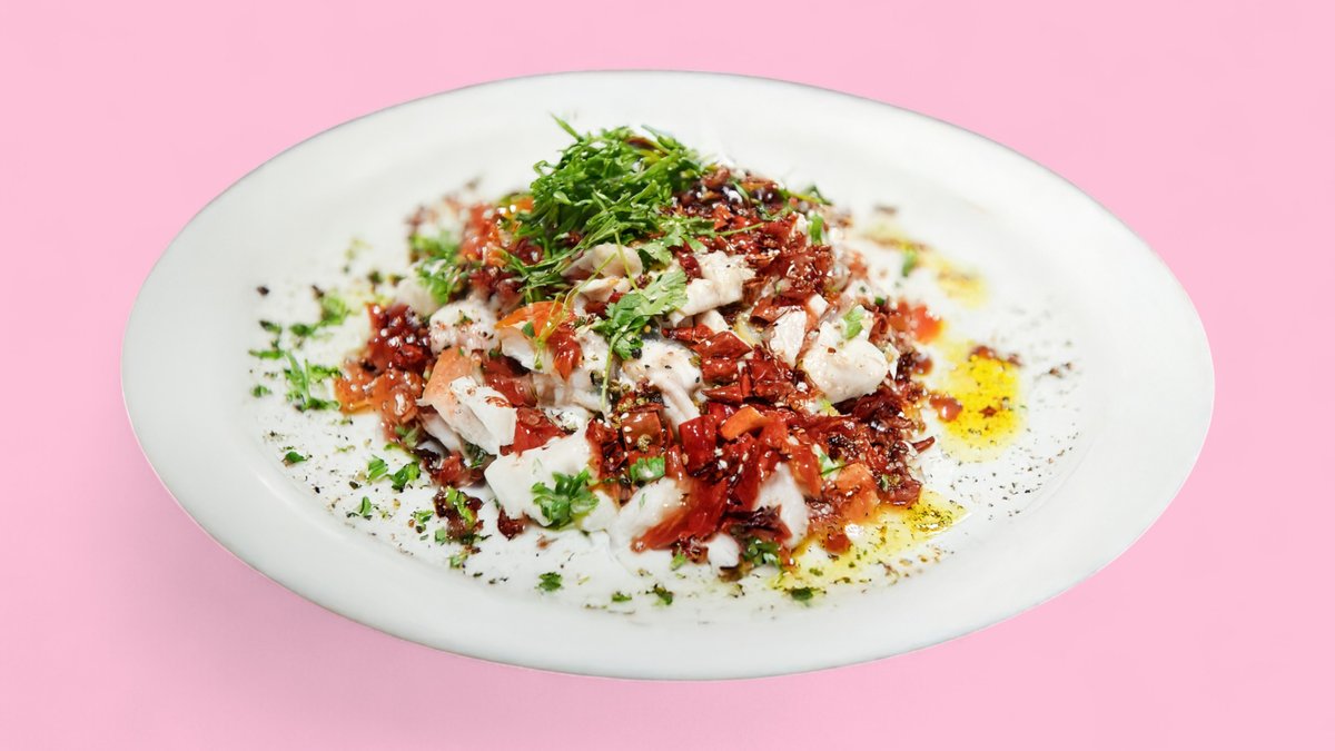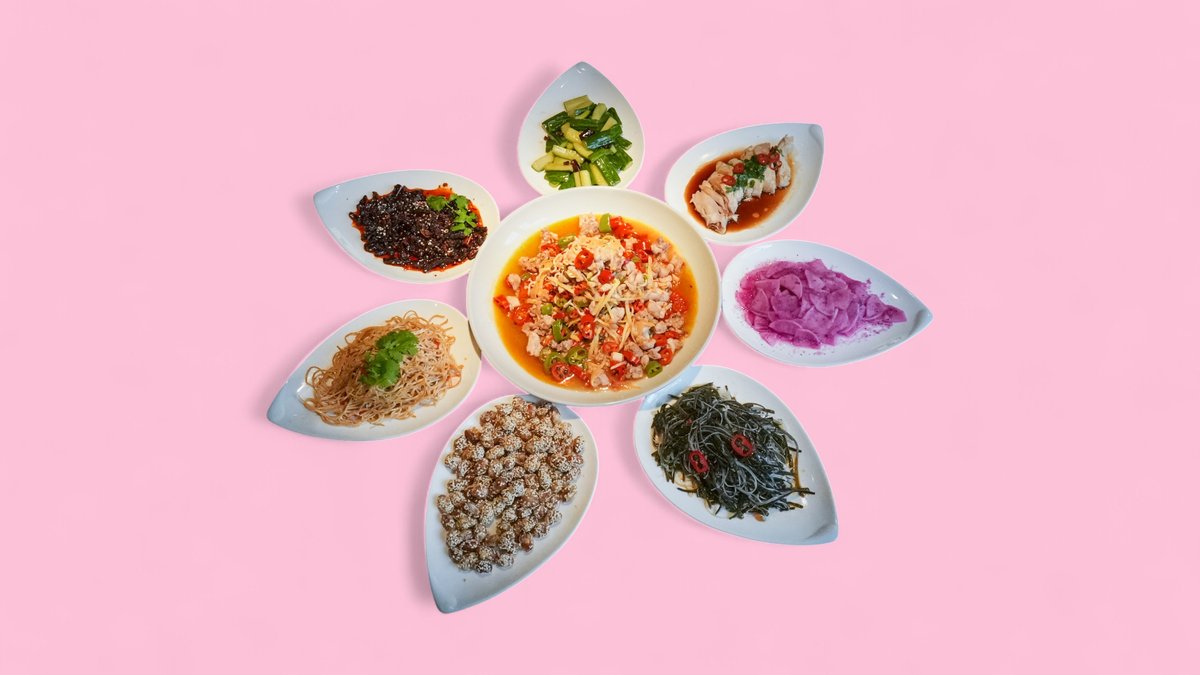 für 5-6 Personen köstliches Kaninchenfleisch mit Sesam-Erdnüssen, Tofu, gerösteten Paprika, knusprigen eingelegten Gurken und Sesamöl