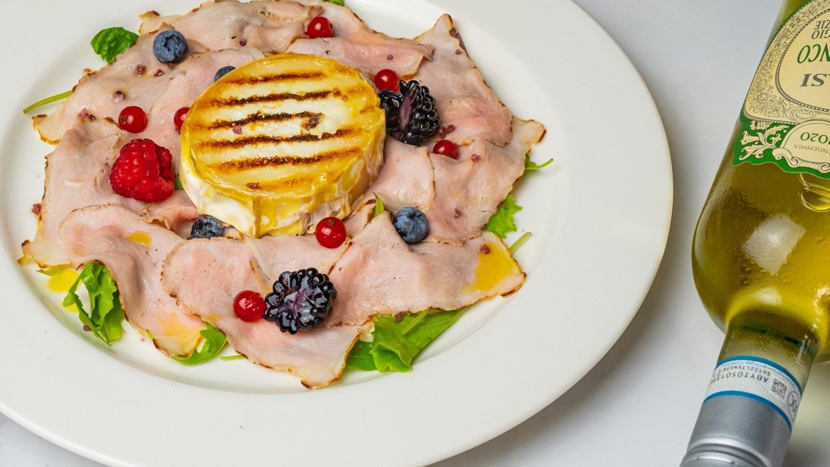 with carpaccio, cooked grape must Serego Alighieri and goat cheese