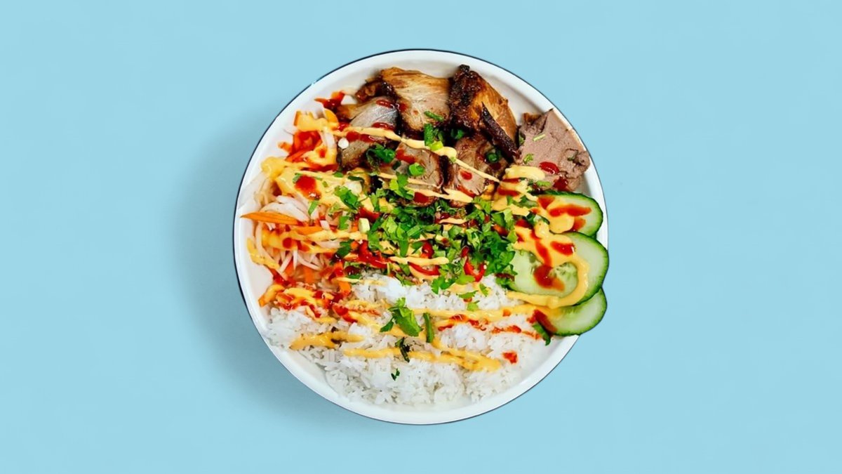 Reis, eingelegter Rettich und Karotten, Gurke, Pastete, Mayonnaise, Koriander, Frühlingszwiebeln