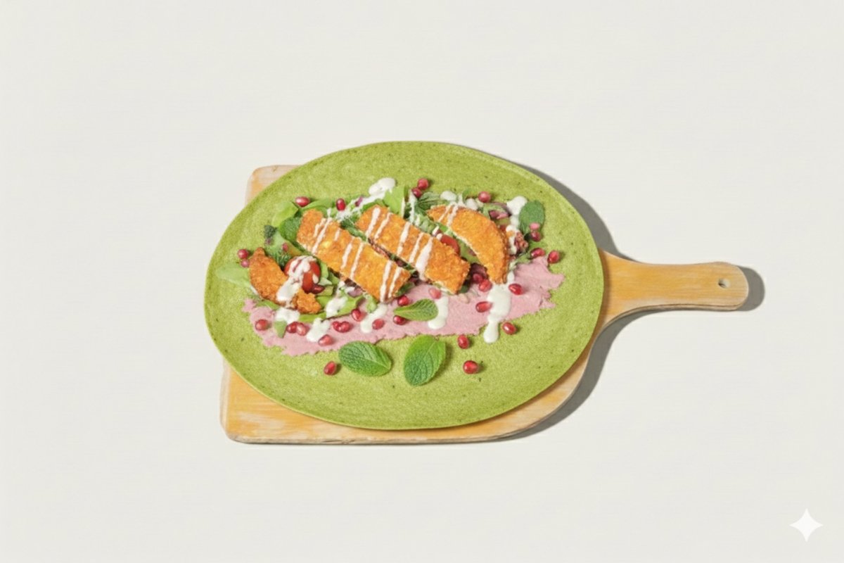 with crunchy chicken (slightly spicy), salad, mint, tomatoes, dill, gherkins, beetroot hummus, pomegranate and homemade sauce