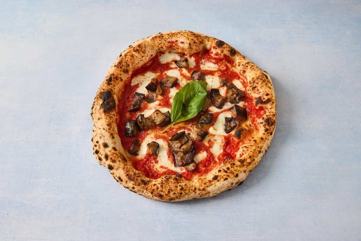mit Pomodor San Marzano, Mozzarella Fior di Latte D.O.P und gebackenen Auberginen, Basilikum, Olivenöl