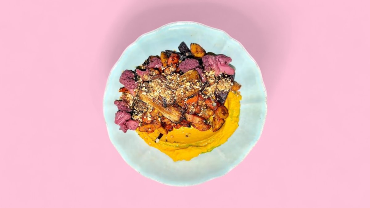 Karottenhummus mit Ofengemüse und Knusper-Dukkah