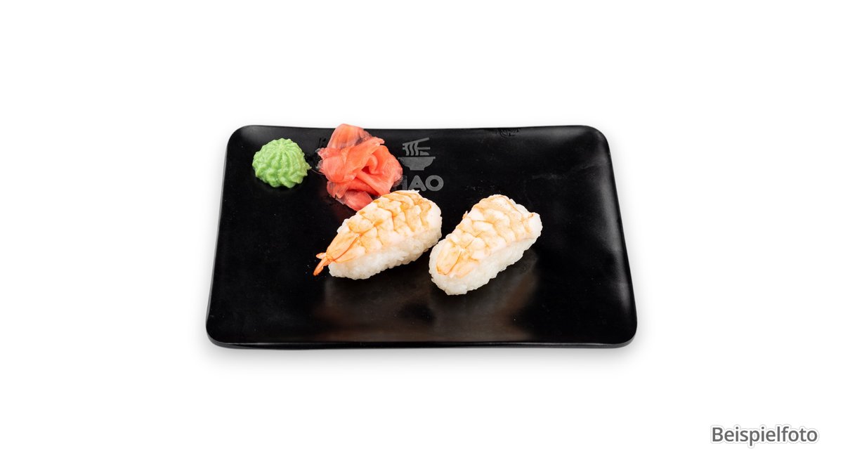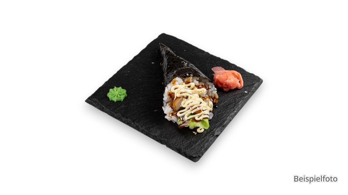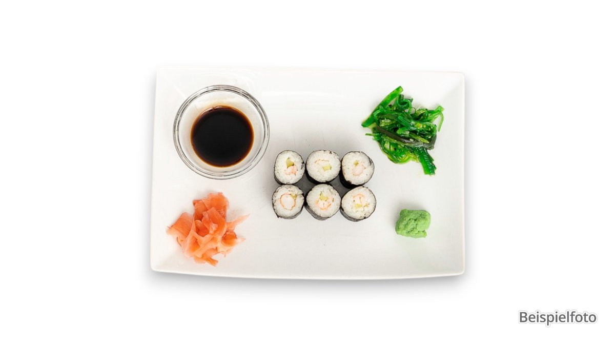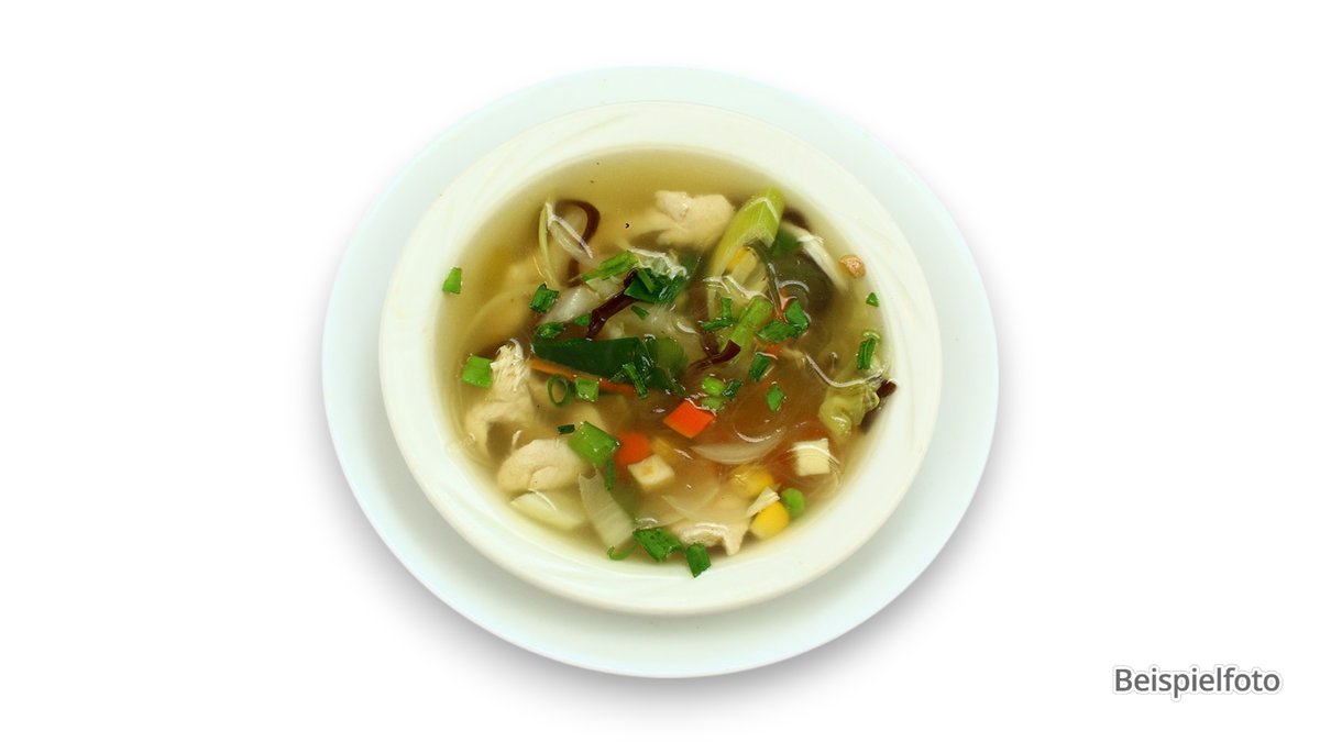 with prawns, Japanese wheat noodles, chicken, champignons and fresh herbs