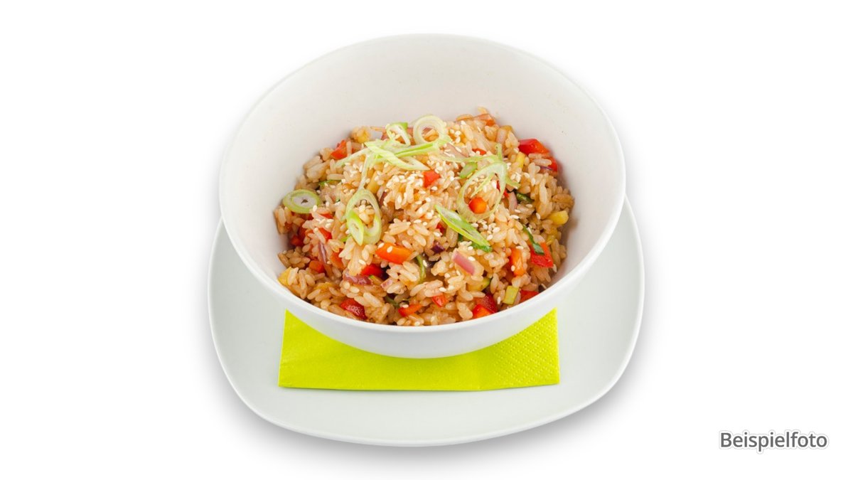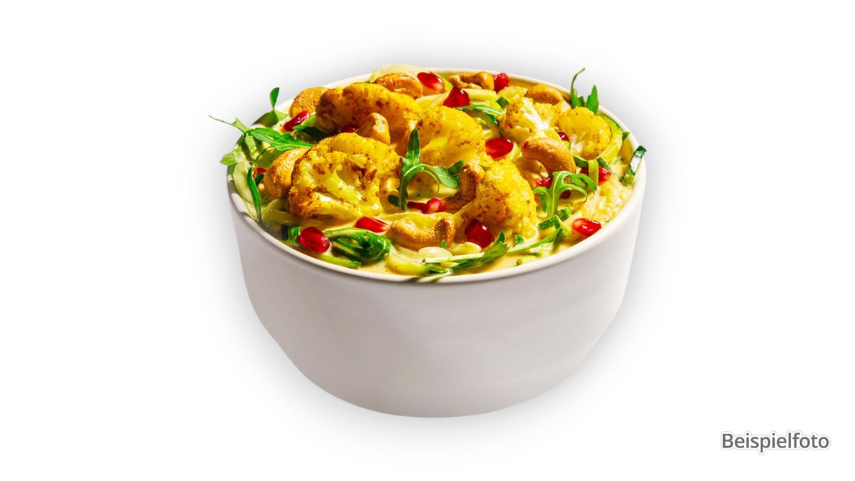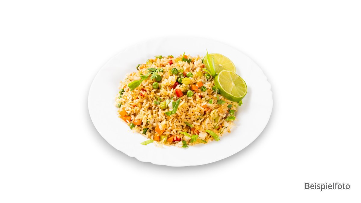 spicy, rice with fresh vegetables, tossed in a wok, creamy coconut curry sauce and an ingredient of your choice