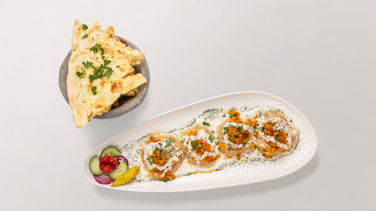 Zwei gewürztes, flaches Fleischpatty aus Hackfleisch, Zwiebeln, Tomaten, Chilischoten, Kräutern und Gewürzen, meist flach gebraten und mit Naan serviert