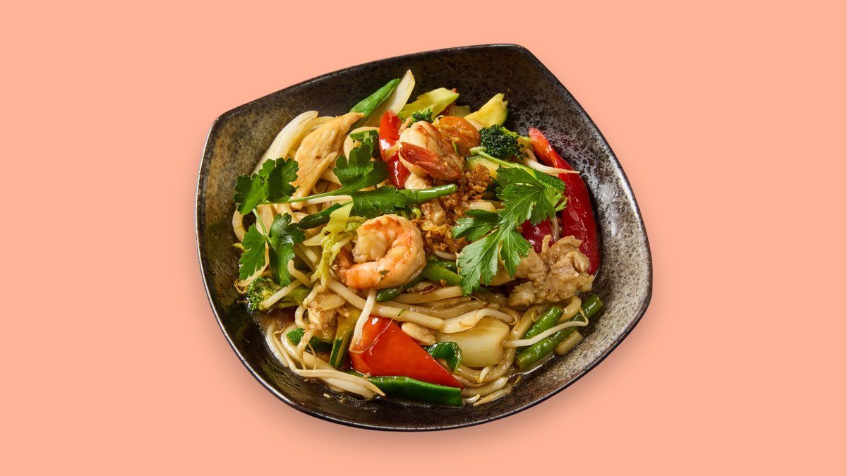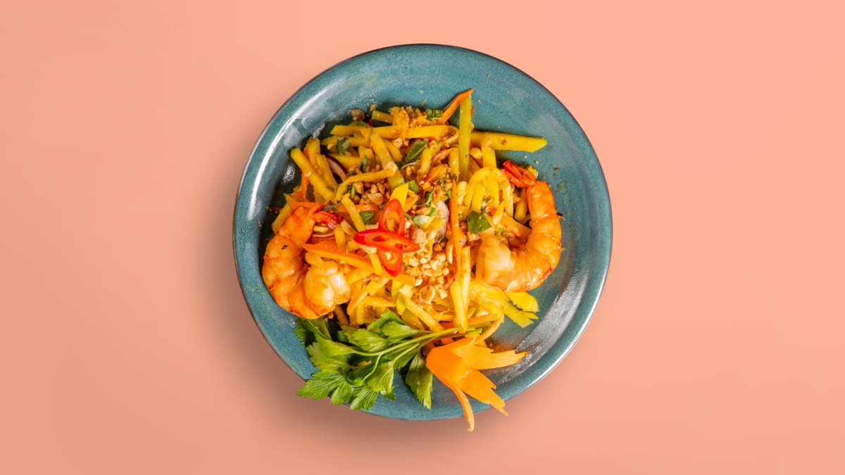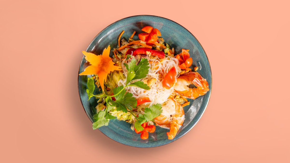 with prawns, champignons, pineapple, lemongrass, cherry tomatoes and coriander