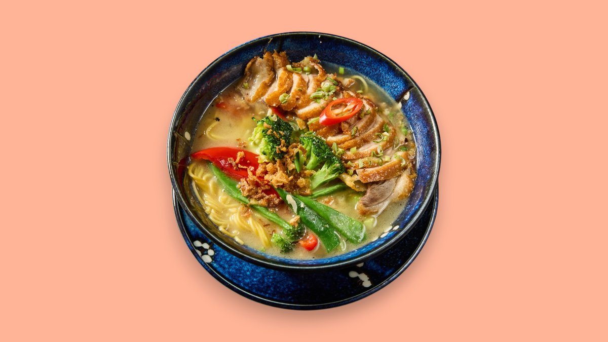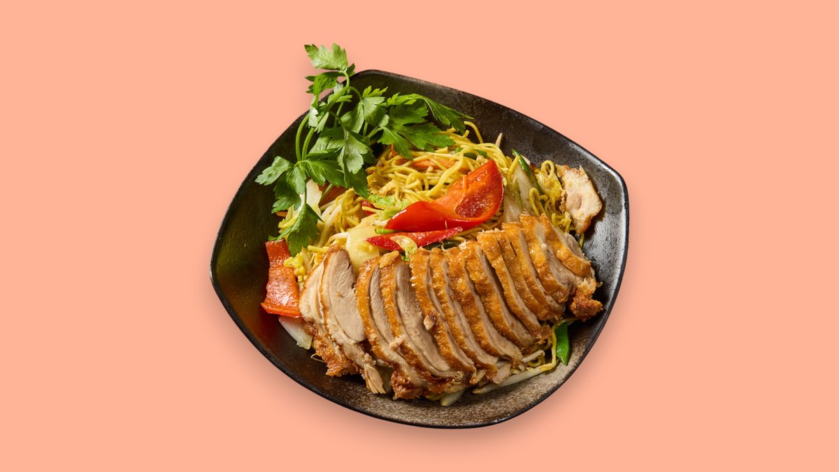 with egg, duck, tomatoes, bell peppers and bamboo shoots