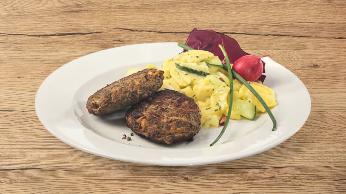 2 Stück, Kartoffel-Gurkensalat, Augustiner Dunkelbiersoße Enthält Alkohol, für Kinder und schwangere Frauen nicht geeignet