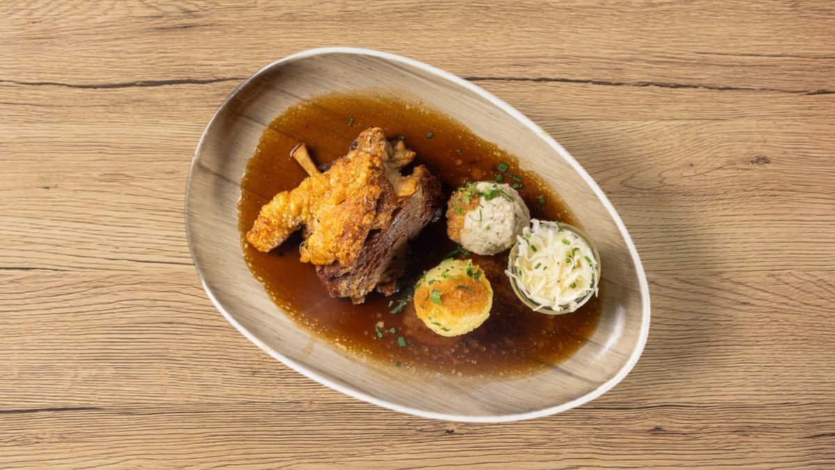 Kartoffelknödel, Krautsalat, Augustiner Dunkelbiersoße Enthält Alkohol, für Kinder und schwangere Frauen nicht geeignet