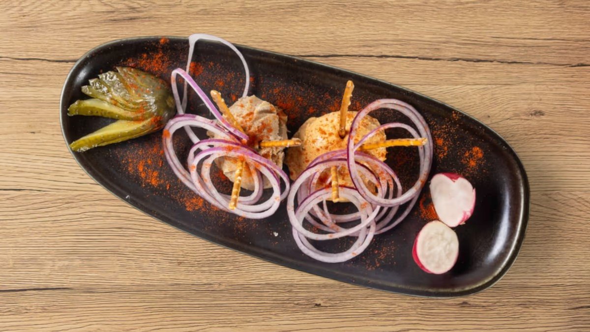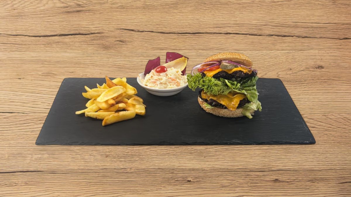 2 Kugeln, Essiggurke, Zwiebelringe und Hausbrot